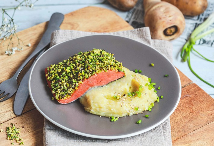 Recette : Saumon sauvage en croûte de pistache, purée de panais et tahini